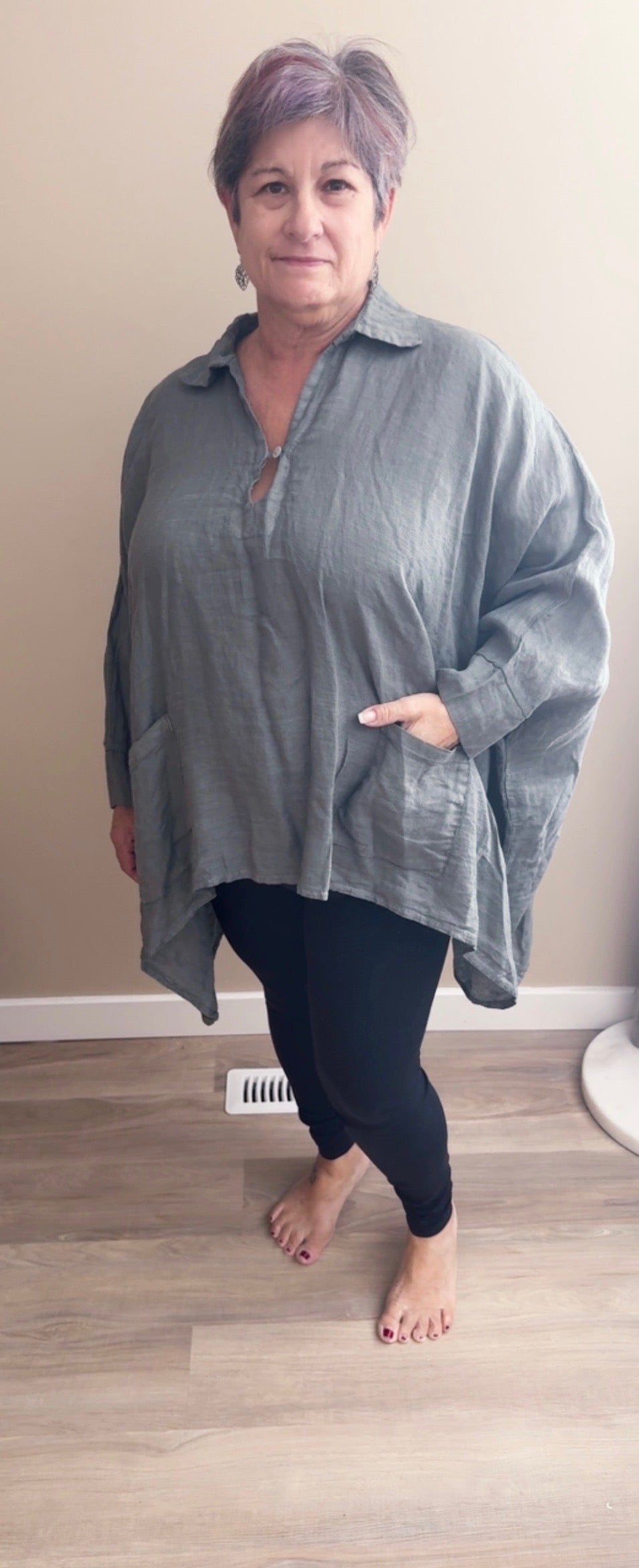 Effortlessly chic and wonderfully versatile, this khaki linen tunic features a crisp collar and charming pocket accents that add just the right amount of personality. Crafted from breathable linen fabric, it's the perfect piece for casual days or dressed-up occasions. One-size-fits-most design means less thinking, more styling.