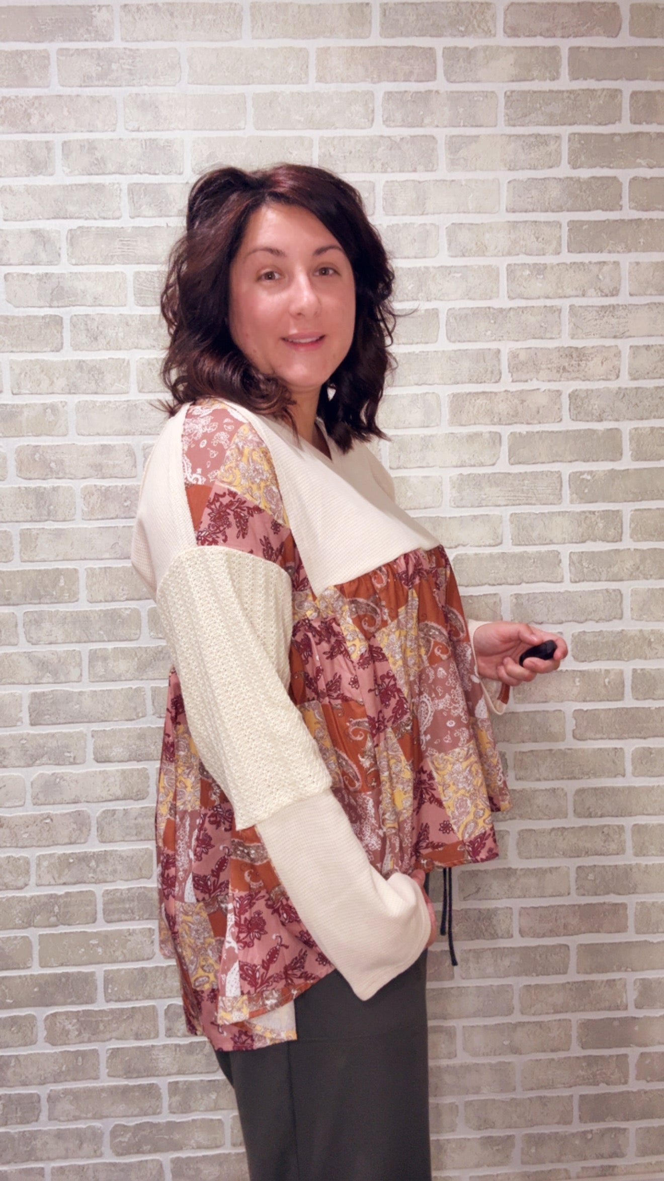 This cozy long-sleeve top features a charming paisley print with whimsical patchwork details for a fun and relaxed look.