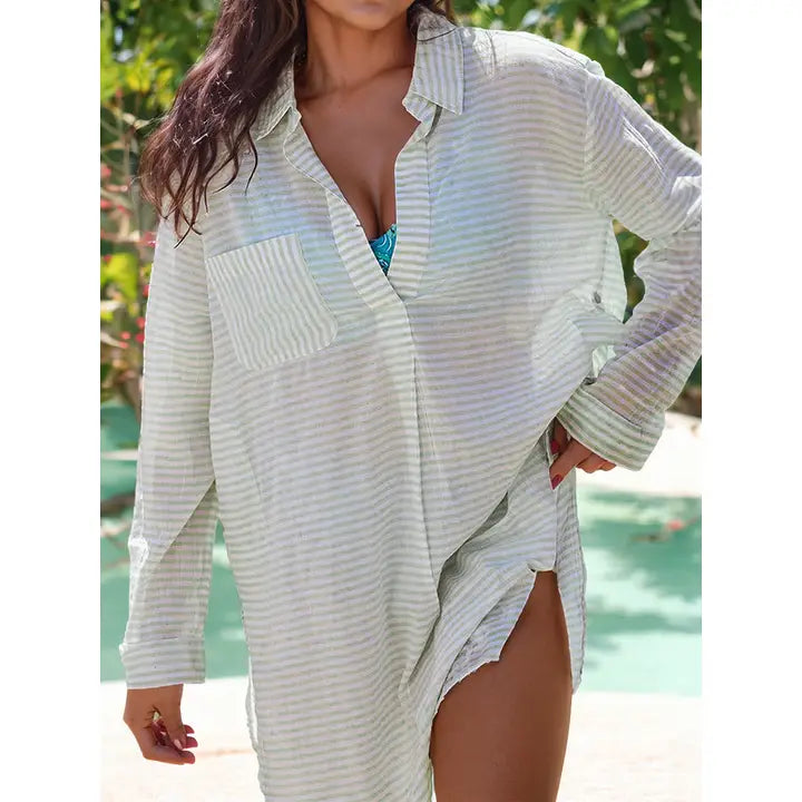 Throw on this breezy striped cover-up and you're ready for sandy adventures! With its relaxed collar and soft fabric, it's the perfect layer for transitioning from beach to boardwalk. Effortless style that keeps up with your coastal lifestyle.